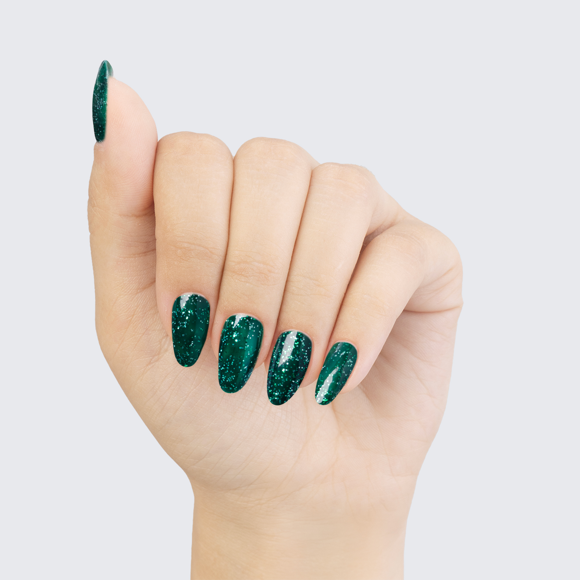 Glitter glistens in the perfect pitch of this deep emerald polish.